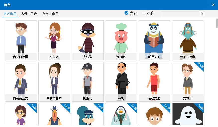 (1)多种角色人物,并且每个角色里面有N种动作,增加动画视频的趣味性跟互动性。