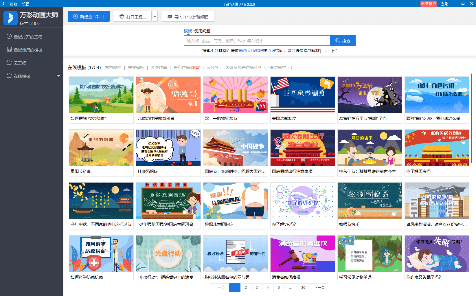 对于新手来说,万彩动画大师有一点真的是做得非常好的,那就是内置了大量了模板!而且每隔一段时间,就会有更新!一些用户做得比较好的模板,也会放上来给大家下载使用。